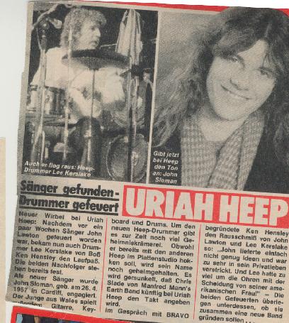 In early 2007 drummer Lee Kerslake had to leave the group due to bad health. They are currently looking for a new drummer. [edit] Acoustically Driven It has been suggested that this section be split into a new article entitled Acoustically Driven. (Discuss) An unplugged concert CD which was recorded in 2001 with some guest musicians. flute: Ian Anderson backing vocals: Kim Chandler, Billie Godfrey, Emma Robbins strings: Pauline Kirke (cello), Liz Chi Yen Liew (violin), Sarah Chi Liew (violin), Saskia Tomkins (viola), Melvin Duffy (pedal steel guitar, slide guitar), Steafan Hannigan (percussion, uillean pipes), other functions: Jim Hughes (guitar technician, stage manager), Pip Williams (acoustic guitar, arranger, producer, string arrangements). See also discography / live albums [edit] Current Members Uriah Heep band members 1969-2007 1969-1970 David Byron vocals Mick Box guitar Ken Hensley keyboards Paul Newton bass guitar Alex Napier drums 1970 David Byron vocals Mick Box guitar Ken Hensley keyboards Paul Newton bass guitar Nigel "Ollie" Olsson drums 1970 David Byron vocals Mick Box guitar Ken Hensley keyboards Paul Newton bass guitar Keith Baker drums 19701971 David Byron vocals Mick Box guitar Ken Hensley keyboards Paul Newton bass guitar Iain Clarke drums 19711972 David Byron vocals Mick Box guitar Ken Hensley keyboards Mark Clarke bass guitar Lee Kerslake drums 19721975 David Byron vocals Mick Box guitar Ken Hensley keyboards Gary Thain bass guitar Lee Kerslake drums 19751976 David Byron vocals Mick Box guitar Ken Hensley keyboards John Wetton bass guitar Lee Kerslake drums 19761979 John Lawton vocals Mick Box guitar Ken Hensley keyboards Trevor Bolder bass guitar Lee Kerslake drums 19791980 John Sloman vocals Mick Box guitar Ken Hensley keyboards Trevor Bolder bass guitar Chris Slade drums 1980-1981 John Sloman vocals Mick Box guitar Gregg Dechert keyboards Trevor Bolder bass guitar Chris Slade drums 19811982 Disbanded 19821983 Peter Goalby vocals Mick Box guitar John Sinclair keyboards Bob Daisley bass guitar Lee Kerslake drums 19831985 Peter Goalby vocals Mick Box guitar John Sinclair keyboards Trevor Bolder bass guitar Lee Kerslake drums 1986 Steff Fontaine vocals Mick Box guitar Phil Lanzon keyboards Trevor Bolder bass guitar Lee Kerslake drums 19862007 Bernie Shaw vocals Mick Box guitar Phil Lanzon keyboards Trevor Bolder bass guitar Lee Kerslake drums 2007 - Present Bernie Shaw vocals Mick Box guitar Phil Lanzon keyboards Trevor Bolder bass guitar Vacant drums [edit] Discography [edit] Studio albums Very 'eavy... Very 'umble (1970) titled Uriah Heep in U.S. Salisbury (1971) Look at Yourself (1971) Demons & Wizards (1972) The Magician's Birthday (1972) Sweet Freedom (1973) Wonderworld (1974) Return to Fantasy (1975) High and Mighty (1976) Firefly (1977) Innocent Victim (1977) Fallen Angel (1978) Conquest (1980) Abominog (1982) Head First (1983) Equator (1985) Raging Silence (1989) Different World (1991) Sea of Light (1995) Sonic Origami (1998) [edit] Live albums Uriah Heep Live (1973) - often referred to as "Live '73" by Heepsters Live at Shepperton '74 (1986) recorded 1974 Live in Europe 1979 (1986) recorded 1979 Live in Moscow (1988) Spellbinder Live (1996) King Biscuit Flower Hour Presents In Concert (1997) recorded 1974 Future Echoes Of The Past (2000) Acoustically Driven (2001) Electrically Driven (2001) The Magician's Birthday Party (2002) Live in the USA (2003) Magic Night (2004) Between Two Worlds (2005) [edit] Compilations Anthology (1986) Lady In Black (1994) The Lansdowne Tapes (1994) recordings by Spice and outtakes from the first three Uriah Heep albums, recorded 19681971 A Time of Revelation (1994) four-disc anthology including much previously unreleased material, recorded 19681995 Uriah Heep: The Collection sixteen songs spanning 19701983(2000) Remasters: The Official Anthology (2001) 20th Century Masters: The Millennium Collection: The Best of Uriah Heep (2001) Chapter & Verse (2005) six-disc anthology including much previously unreleased material, recorded 19681998, plus book and bonus poster Very Best of Uriah Heep (2006) Easy Livin': Singles A's & B's (2006) anthology including almost all the band's singles, which includes several songs not available in the original albums [edit] Trivia The band is named after the character Uriah Heep from the novel David Copperfield by Charles Dickens. The power metal collaboration between Blind Guardian's vocalist Hansi Kόrsch and Iced Earth's guitarist Jon Schaffer, called Demons & Wizards, takes its name from Uriah Heep's 1972 album Demons and Wizards. [edit] See also David Byron Ken Hensley John Lawton Spice Heepster Roger Dean [edit] External links The Official Uriah Heep Website o Mick Box' official website o Ken Hensley's official website o Official tribute website to David Byron o Official tribute website to Gary Thain Uriah Heep at MusicBrainz Retrieved from "http://en.wikipedia.org/wiki/Uriah_Heep_%28band%29" Louis Rentrop Webmaster www.uriah-heep.com | Official Uriah Heep Homepage | www.uriahheepholland.com | Dutch Uriah Heep fanpage | www.moreheep.com | Classic Uriah Heep Homepage | Voor alle Heep CD's en DVD's | For all Heep CD's en DVD's "The Musicsafe" creditcard is niet nodig. Een Nederlands bedrijf. Click : http://www.themusicsafe.com/index.asp?xlnk=1463573920 www.moreheep.com ARROWROCK,MOJO,LICTENVOORDE,FESTIVAL,FESTIVALS,WOODSTOCK,WOEDSTOK,WOODSTOK,WHIGHT,KRALINGEN,HARDROCK,SPEEDROCK,GRUNGE,ROCKHARD,A Piedi ROCKBANDS,ROCK,ROCKBANDS,FAMOUS,ROCKBAND,FAMOUS,ROCKBANDS,FEMOUS,FEMOOS,FEMOUS,FAMOOS,FAMOES,ROKC,ROKCBAND,ROCKBENDS,ROCKBAND,CLASSICROCKBAND,KLASSIEKROCK,KLASSIC,CLASSICK,ROCK, PINKPOP,BOSPOP,TORHOUT,WERCHTER,STONEHENGE,ARROW, ARROWROCK,MOJO,LICTENVOORDE,FESTIVAL,FESTIVALS,WOODSTOCK,WOEDSTOK,WOODSTOK,WHIGHT,KRALINGEN,HARDROCK,SPEEDROCK,GRUNGE,ROCKHARD,A Piedi ROCKBANDS,ROCK,ROCKBANDS,FAMOUS,ROCKBAND,FAMOUS,ROCKBANDS,FEMOUS,FEMOOS,FEMOUS,FAMOOS,FAMOES,ROKC,ROKCBAND,ROCKBENDS,ROCKBAND,CLASSICROCKBAND,