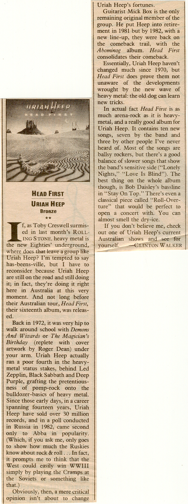 In early 2007 drummer Lee Kerslake had to leave the group due to bad health. They are currently looking for a new drummer. [edit] Acoustically Driven It has been suggested that this section be split into a new article entitled Acoustically Driven. (Discuss) An unplugged concert CD which was recorded in 2001 with some guest musicians. • flute: Ian Anderson • backing vocals: Kim Chandler, Billie Godfrey, Emma Robbins • strings: Pauline Kirke (cello), Liz Chi Yen Liew (violin), Sarah Chi Liew (violin), Saskia Tomkins (viola), • Melvin Duffy (pedal steel guitar, slide guitar), Steafan Hannigan (percussion, uillean pipes), • other functions: Jim Hughes (guitar technician, stage manager), Pip Williams (acoustic guitar, arranger, producer, string arrangements). See also discography / live albums [edit] Current Members Uriah Heep band members 1969-2007 1969-1970 • David Byron – vocals • Mick Box – guitar • Ken Hensley – keyboards • Paul Newton – bass guitar • Alex Napier – drums 1970 • David Byron – vocals • Mick Box – guitar • Ken Hensley – keyboards • Paul Newton – bass guitar • Nigel "Ollie" Olsson – drums 1970 • David Byron – vocals • Mick Box – guitar • Ken Hensley – keyboards • Paul Newton – bass guitar • Keith Baker – drums 1970–1971 • David Byron – vocals • Mick Box – guitar • Ken Hensley – keyboards • Paul Newton – bass guitar • Iain Clarke – drums 1971–1972 • David Byron – vocals • Mick Box – guitar • Ken Hensley – keyboards • Mark Clarke – bass guitar • Lee Kerslake – drums 1972–1975 • David Byron – vocals • Mick Box – guitar • Ken Hensley – keyboards • Gary Thain – bass guitar • Lee Kerslake – drums 1975–1976 • David Byron – vocals • Mick Box – guitar • Ken Hensley – keyboards • John Wetton – bass guitar • Lee Kerslake – drums 1976–1979 • John Lawton – vocals • Mick Box – guitar • Ken Hensley – keyboards • Trevor Bolder – bass guitar • Lee Kerslake – drums 1979–1980 • John Sloman – vocals • Mick Box – guitar • Ken Hensley – keyboards • Trevor Bolder – bass guitar • Chris Slade – drums 1980-1981 • John Sloman – vocals • Mick Box – guitar • Gregg Dechert – keyboards • Trevor Bolder – bass guitar • Chris Slade – drums 1981–1982 Disbanded 1982–1983 • Peter Goalby – vocals • Mick Box – guitar • John Sinclair – keyboards • Bob Daisley – bass guitar • Lee Kerslake – drums 1983–1985 • Peter Goalby – vocals • Mick Box – guitar • John Sinclair – keyboards • Trevor Bolder – bass guitar • Lee Kerslake – drums 1986 • Steff Fontaine – vocals • Mick Box – guitar • Phil Lanzon – keyboards • Trevor Bolder – bass guitar • Lee Kerslake – drums 1986–2007 • Bernie Shaw – vocals • Mick Box – guitar • Phil Lanzon – keyboards • Trevor Bolder – bass guitar • Lee Kerslake – drums 2007 - Present • Bernie Shaw – vocals • Mick Box – guitar • Phil Lanzon – keyboards • Trevor Bolder – bass guitar • Vacant – drums [edit] Discography [edit] Studio albums • Very 'eavy... Very 'umble (1970) – titled Uriah Heep in U.S. • Salisbury (1971) • Look at Yourself (1971) • Demons & Wizards (1972) • The Magician's Birthday (1972) • Sweet Freedom (1973) • Wonderworld (1974) • Return to Fantasy (1975) • High and Mighty (1976) • Firefly (1977) • Innocent Victim (1977) • Fallen Angel (1978) • Conquest (1980) • Abominog (1982) • Head First (1983) • Equator (1985) • Raging Silence (1989) • Different World (1991) • Sea of Light (1995) • Sonic Origami (1998) [edit] Live albums • Uriah Heep Live (1973) - often referred to as "Live '73" by Heepsters • Live at Shepperton '74 (1986) – recorded 1974 • Live in Europe 1979 (1986) – recorded 1979 • Live in Moscow (1988) • Spellbinder Live (1996) • King Biscuit Flower Hour Presents In Concert (1997) – recorded 1974 • Future Echoes Of The Past (2000) • Acoustically Driven (2001) • Electrically Driven (2001) • The Magician's Birthday Party (2002) • Live in the USA (2003) • Magic Night (2004) • Between Two Worlds (2005) [edit] Compilations • Anthology (1986) • Lady In Black (1994) • The Lansdowne Tapes (1994) – recordings by Spice and outtakes from the first three Uriah Heep albums, recorded 1968–1971 • A Time of Revelation (1994) – four-disc anthology including much previously unreleased material, recorded 1968–1995 • Uriah Heep: The Collection – sixteen songs spanning 1970–1983(2000) • Remasters: The Official Anthology (2001) • 20th Century Masters: The Millennium Collection: The Best of Uriah Heep (2001) • Chapter & Verse (2005) – six-disc anthology including much previously unreleased material, recorded 1968–1998, plus book and bonus poster • Very Best of Uriah Heep (2006) • Easy Livin': Singles A's & B's (2006) – anthology including almost all the band's singles, which includes several songs not available in the original albums [edit] Trivia • The band is named after the character Uriah Heep from the novel David Copperfield by Charles Dickens. • The power metal collaboration between Blind Guardian's vocalist Hansi Kόrsch and Iced Earth's guitarist Jon Schaffer, called Demons & Wizards, takes its name from Uriah Heep's 1972 album Demons and Wizards. [edit] See also • David Byron • Ken Hensley • John Lawton • Spice • Heepster • Roger Dean [edit] External links • The Official Uriah Heep Website o Mick Box' official website o Ken Hensley's official website o Official tribute website to David Byron o Official tribute website to Gary Thain • Uriah Heep at MusicBrainz Retrieved from "http://en.wikipedia.org/wiki/Uriah_Heep_%28band%29" Louis Rentrop Webmaster www.uriah-heep.com | Official Uriah Heep Homepage | www.uriahheepholland.com | Dutch Uri